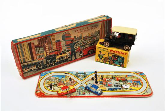 SSS (JAPAN) FRICTION POWERED CADILLAC; AND TECHNOFIX TRAFFIC CROSSING WITH POLICE CONTROL WITH KEY (E-M BOXES P-E) (2)