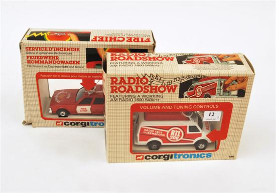 TWO CORGITRONIC MODELS INCLUDING 1006 RADIO ROADSHOW WITH WORKING AM RADIO; AND 1008 FIRE CHIEF WITH ELECTRONIC FLASHING BEACON AND SIREN (M BOXES F-VG) (2)