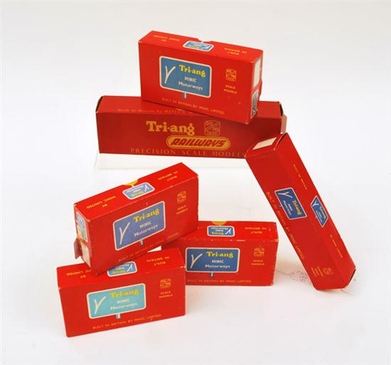 TRIANG RAILWAYS R.237 DEPRESSED CENTRE CAR WITH LOW LOADER/BULLDOZER LOAD; MINIC MOTORWAYS RM 922 RAILWAY CAR; AND 4 X TRIANG MINIC VEHICLES (6)