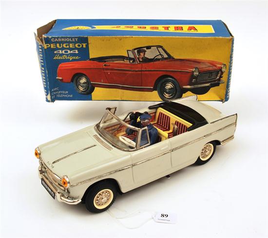 JOUSTRA (FRANCE) CABRIOLET PEUGEOT 404 ELECTRIQUE WITH DRIVER AND TELEPHONE, LIGHT GREY BODY, LITHOGRAPHED INTERIOR, BLUE SUITED DRIVER HOLDING BLACK TELEPHONE (VG-E BOX G)