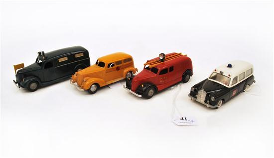 FOUR TEKNO MODELS INCLUDING FIRE DEPT. ENGINE; FALCK ZONEN; POLICE VAN; AND PACKARD MAIL CAR, ALL UNBOXED (G-M) (4)
