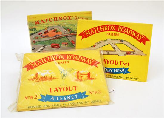 THREE MATCHBOX LAYOUTS INCLUDING 1ST ISSUE LAYOUT NO.R2; NO.1 LAYOUT; AND R-1 ROADWAY SERIES (E-M PACKAGING G-VG) (3)