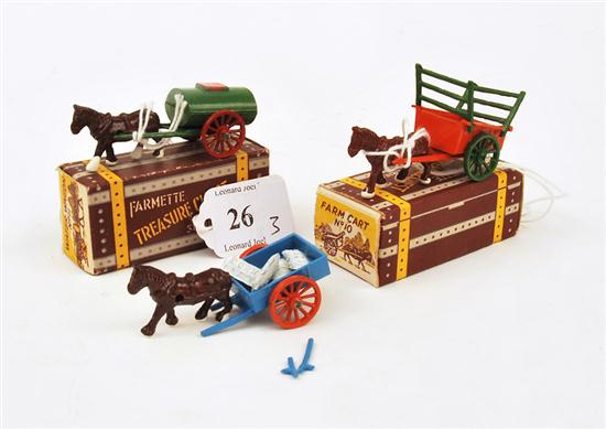 THREE MOKO FARMETTE MODELS INCLUDING NO.10 FARM CART; NO.11 WATER WAGON; AND ONE OTHER WITH BROKEN CART ARM AND UNBOXED (G-M BOXES E) (3)