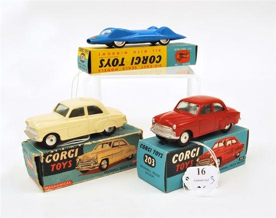 THREE CORGI MODELS INCLUDING 153A PROTEUS; 203 VAUXHALL VELOX SALOON, CREAM WITH GREEN TINTED WINDOWS; AND 203M MECHANICAL VAUXHALL VELOX SALOON, RED WITH GREEN TINTED WINDOWS (E BOXES F-E) (3)