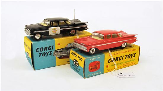 TWO CORGI MODELS INCLUDING 220 CHEVROLET IMPALA, SALMON PINK WITH LEMON INTERIOR; AND 223 CHEVROLET 'STATE PATROL', BLACK WITH SILVER TRIM, LEMON INTERIOR AND DECALS TO DOOR (E-M BOXES E) (2)