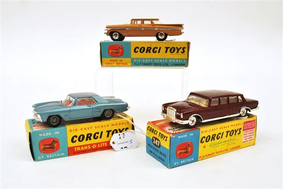 THREE CORGI MODELS INCLUDING 245 BUICK RIVIERA, METALLIC BLUE WITH RED INTERIOR; 247 MERCEDES BENZ 600 PULLMAN, MAROON; AND 248 CHEVROLET 'IMPALA' TWO TONE, FAWN WITH CREAM ROOF (M BOXES G-E) (3)