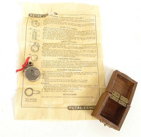 SAKURA SEIKI PETAL SUBMINIATURE CAMERA, JAPAN, CIRCA 1948, CHROME METAL BODY WITH INSTRUCTIONS, IN WOODEN BOX