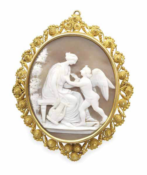The finely carved shell cameo depicting a Grecian lady and cupid, in cannetille frame, in 18ct gold, boxed.