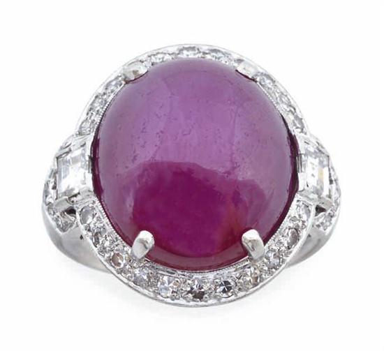 Centred with an oval synthetic ruby displaying star phenomenon, weighing 17.5cts within a border of single cut diamonds and geometric diamond set shoulders, in platinum, ring size Q-R.