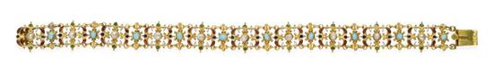 The finely crafted open work panels, set with turquoise, seed pearls and coloured enamel, in 9ct gold, total length 180mm, in original fitted box.