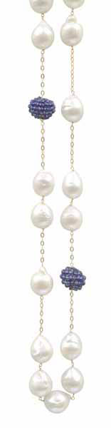 Comprising twenty five baroque pearls spaced on a fine 18ct gold trace chain with two feature beads, set with small faceted sapphires, total length 940mm.