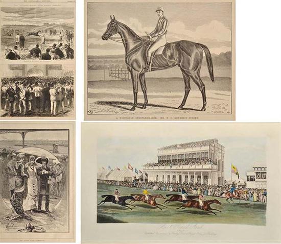including: 'Flemington In The Morning: The Training Ground' and 'The Betting-Room At Night', 1873, in common mount; 'A Victorian Steeplechaser: Mr F.C. Goyder's Sussex', 1881; and 'The Autumn Races', 1881; and 'Ascot Grand Stand 1840', framed (4)