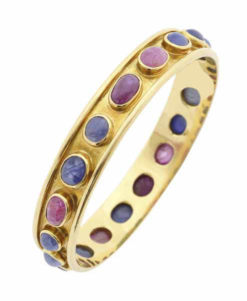 The full circle bangle centred with bezel set rubies and sapphires cut en cabochon, in 18ct gold, independent valuation available.
