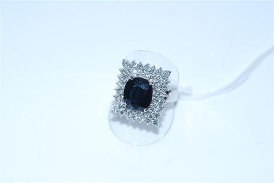Centred with an oval sapphire weighing 3.50cts, within a stepped double row of round brilliant cut diamonds totalling 1.0ct, in 14ct white gold, ring size M-N.