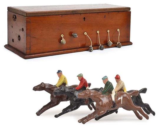 Edwardian, possibly English, similar to 'Ascot' racing game by J. Jaques, comprising mahogany rectangular box with clockwork mechanism that winds and 'races' six painted lead horses and jockeys when attached to six protruding strings, including one extra horse