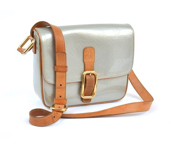 Styled in grey monogram vernis leather with tan leather trim and gold metal hardware, M91107, 25 x 20cm.