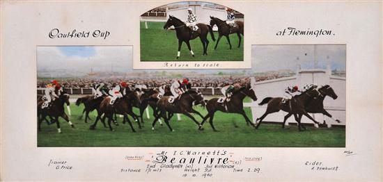 hand coloured photograph by 'Akers Melb.' in common mount with photograph of 'Return To Scale', inscribed details to mount 'Caulfield Cup at Flemington/ Mr E.C. Harnett's 'Beaulivre' (N.Z.) (Beau Pere) (Pass Book)/ Trainer G. Price Rider A. Dewhurst/ 2nd Gladyner (N.Z.) 3rd Historian/ Distance 1 1/2 mls Weight 9st Time 2.29/ 19.10.1940', framed