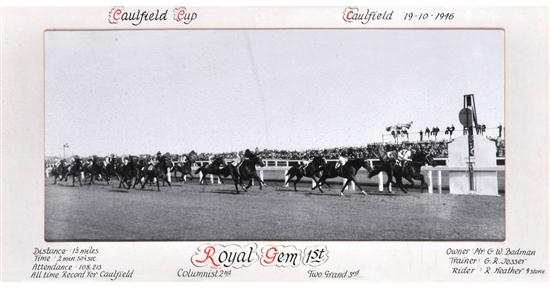 both black and white, with inscribed details to mounts including '...Caulfield 19-10-1946/ Royal Gem 1st/ Columnist 2nd Two Grand 3rd/ Distance: 1 1/2 miles/ Time: 2 min. 30 1/4sec./ Attendance: 108,213/ All Time Record for Caulfield/ Owner Mr G.W. Badman/ Trainer: G.R. Jesser/ Rider: R. Heather 9 stone', framed