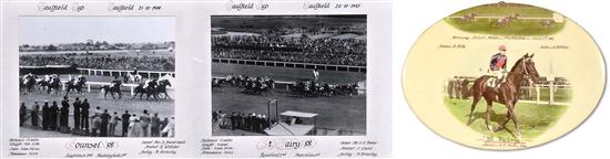 both black and white, with inscribed details to mounts '...Counsel 1st/ Lawrence 2nd Huntingdale 3rd' and '...St. Fairy 1st/ Rainbird 2nd Punctilia 3rd/, both ridden by 'A. Breasley'; and an oval hand coloured photograph on tin of 'St Fairy' winning the 'Select Stakes....Cheltenham....June 1st 1946' (3)