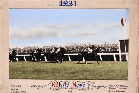 hand coloured photograph by 'Tony Simon', with inscribed race details to mount '1931 White Nose 1st/ Shadow King 2nd Concentrate 3rd/ Time 3-26/ Won by 2 lengths, 1/2 nk./ Owner: H.P. McLachlan/ Trainer: E.J. Hatwell/ Jockey: N. Percival' , framed, water damage to mount on one side
