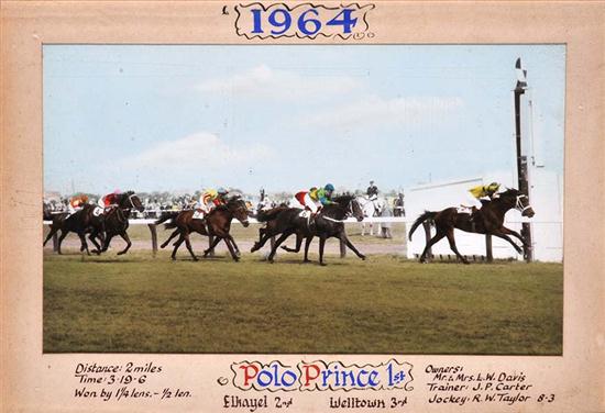hand coloured with inscribed details to mount '1964/ Polo Prince 1st/ Elkayal 2nd/ Welltown 3rd/ Distance: 2 miles/ Time: 3-19-6/ Won by 1 1/4 lens. - 1/2 len./ Owners: Mr & Mrs L.W. Davis/ Trainer: J.P. Carter/ Jockey: R.W. Taylor 8-3', framed