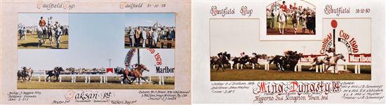 colour, with inset photograph of return to scale, with inscribed details to mount 'Caulfield Cup...18-10-80/ Ming Dynasty 1st (Planet Kingdom Chow Mein)/ Hyperno 2nd Kingston Town 3rd/ Jockey: E.J. Didham 58kg/ Distance: 2400 metres/ Time 2.28.7/ Owners: Mr & Mrs J.B. Cummings/ Mr & Mrs R.A. Websdale/ L & Mrs J. Foster/ Trainer: J.B. Cummings'; and a photograph of the finish of the 1978 Caulfield Cup won by Taksan, both framed (2)