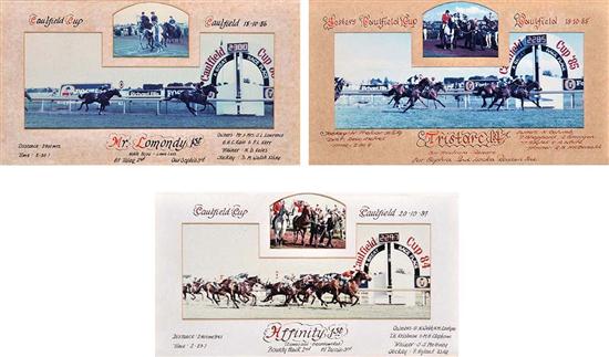 all colour, showing winners Affinity; Tristarc; and Mr Lomondy, with race details inscribed to mount and inset photographs of return to scale, framed (3)