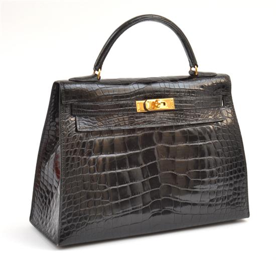 Styled in black alligator with gold metal hardware with a shoulder strap, boxed, 32cm.