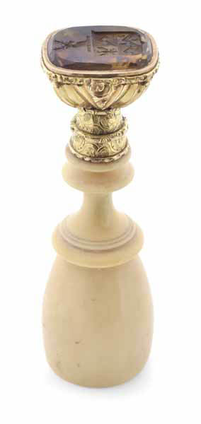 With turned ivory handle and citrine intaglio, to a gilded fitting, height 9.5cm.