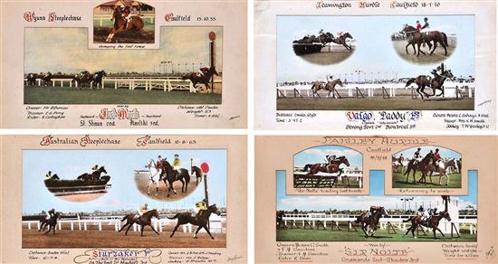 all hand coloured, two by 'Akers & Co. Melb.', two by 'Tony Simon', including 'Paisley Hurdle 30/9/48 Won by 'Sir Nolt'; 'Wyuna Steeplechase 15.10.55 Won By Just Mark'; 'Australian Steeplechase 10-8-63 Won by Sturzaker'; and 'Leamington Hurdle 18-7-70 Valgo 'Laddy', all framed