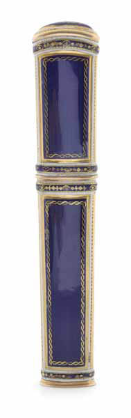 In the Fabergé style, decorated with navy blue guilloche enamel and intricate gold decoration, in 18ct gold, length 10.5cm.