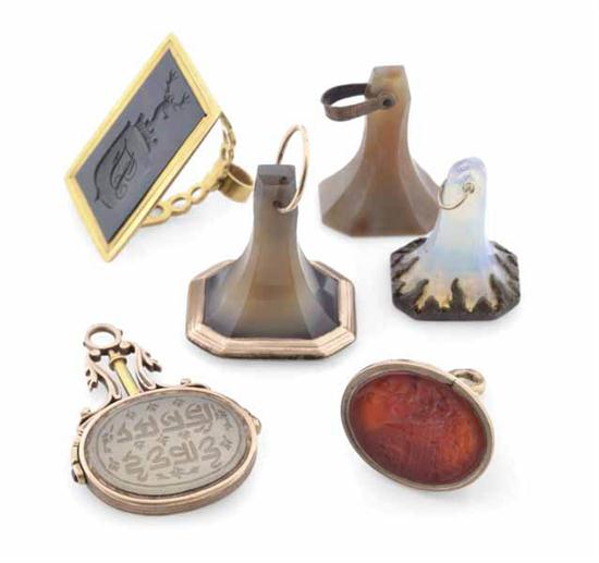 The collection including bloodstone, opalized glass, agate and carnelian, in gold and gilded settings.