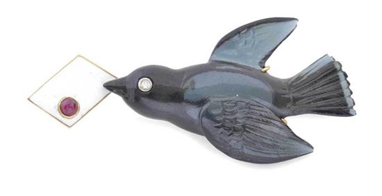 The stylized green glass pigeon with diamond set eye carrying a white enamel letter set with a red tourmaline, in 18ct gold signed K.T.