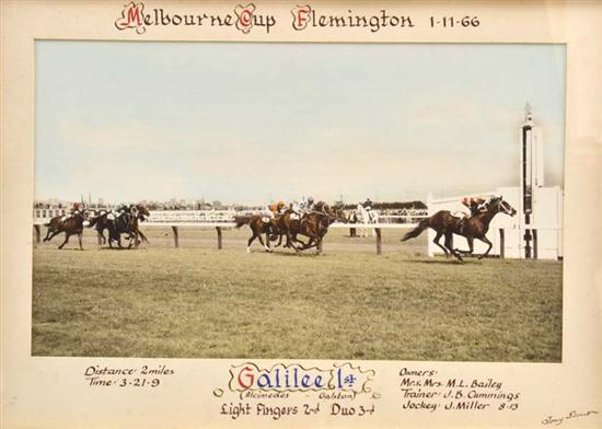 hand coloured by 'Tony Simon' with race details inscribed to mount 'Melbourne Cup Flemington 1-11-66/ Galilee 1str (Alcimedes - Galston)/ Light Fingers 2nd Duo 3rd/ Distance: 2 miles/ Time 3-21.9/ Owners: Mr & Mrs M.L. Bailey/ Trainer: J.B. Cummings/ Jockey: J. Miller 8-13' , framed