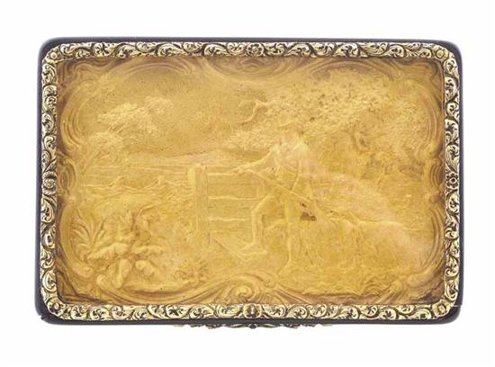 The rectangular tortoise shell box, with applied glaze,18ct gold panel depicting a hunting scene, further applied scroll and foliate decoration to the lid, 7.5 x 5cm.