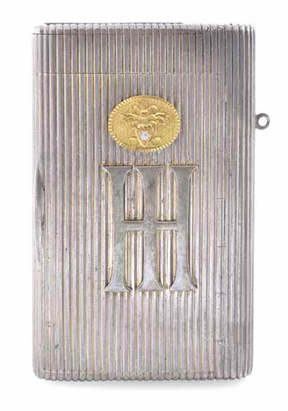 A RUSSIAN SILVER CIGARETTE CASE - PETERSBURG CIRCA 1890 - Manufactured between 1893-1896, bearing the makers mark HW, the gilded interior lid bearing the inscription 'From Field Marshall Great Prince Nicolai-Nicolaevecha to Captain the elder Alex Josefouvicu Moravichu 29th August 1890 Warzawa', the outer case with reeded decoration and possible later applied diamond set coat of arms, 9 x 5.5cm.