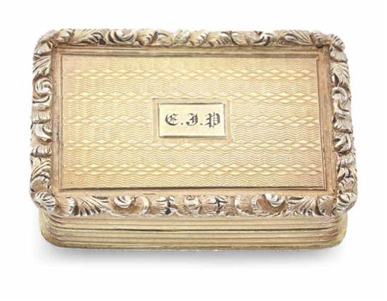 The engine turned case with chased decoration to the lid and gilded interior, the inner lid inscribed 'With the donors esteem', hallmarked Birmingham 1835-36, maker M.N., 3 x 2cm.