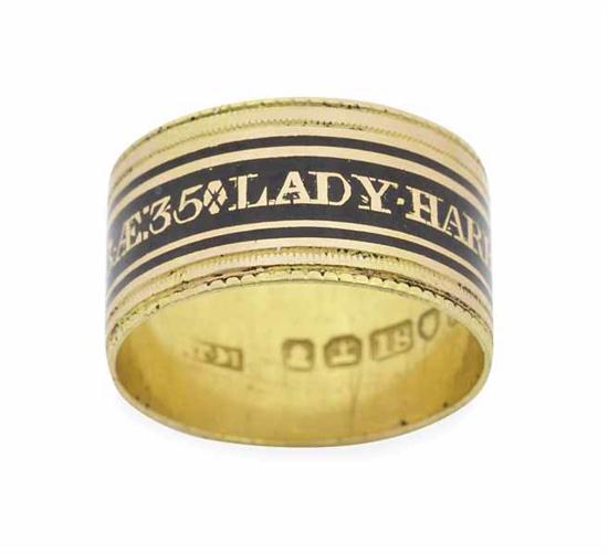 With beaded edge and black enamel inscription 'Lady Harriett Gill , OB. 26 NOV 1813 AE 35', with screw top ivory box, ring size L-M.