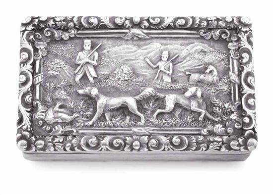 The rectangular case decorated with engine turned and reeded detail, the lid with a hunting scene motif in relief, rubbed hallmark Birmingham possibly 1834-35, maker W.S, 7 x 4cm.