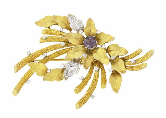 Of floral and foliate design centred with a purple tourmaline with round brilliant cut diamond detail, in 18ct gold.