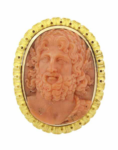 The finely detailed bust of a classical figure within a decorative frame in 22ct gold.