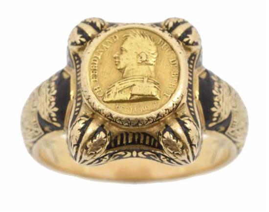 The ring with black enamel leaf corners and hinged lid set with a medallion with profile portrait of Charles Ferdinand, Duc de Berry, signed 'Leclec F', inscribed to the reverse 'Cheveux de C.F. Duc de Berry pris sur lui le 14 Feb. 1920 par son aide de camp le Pce. Theodor de Bauiffremont', in 18ct gold, ring size R.