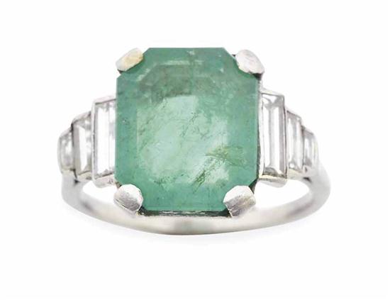 Centred with an emerald cut emerald flanked by stepped baguette cut diamond set shoulders, in platinum, ring size L-M.