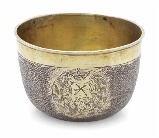 The granulated silver beaker with engraved crest and gilded rim and interior, hallmarked with the Russian 84 silver mark, maker A.H, height 4.5cm.