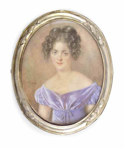 AN ANTIQUE PORTRAIT MINIATURE ON VELLUM - Signed Jean Baptiste Singry (1782-1824), the oval hand painted miniature depicting a lady in eighteenth dress, housed within a foliate hammer worked silver frame hallmarked E.R. 800, 10cm diameter.