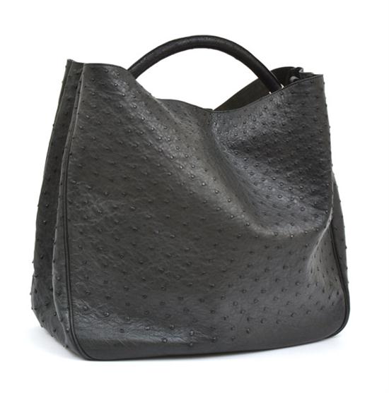 Styled in green ostrich skin with silver metal hardware, 44 x 34cm.