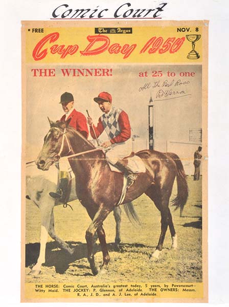 COMIC COURT 1950 MELBOURNE CUP ARGUS SUPPLEMENT SIGNED BY JOCKEY PAT GLENNON