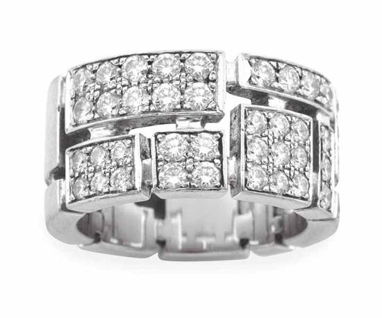 The wide geometric band bead set with fifty two round brilliant cut diamonds, altogether totalling 1.80cts, in 18ct white gold, ring size M-N.