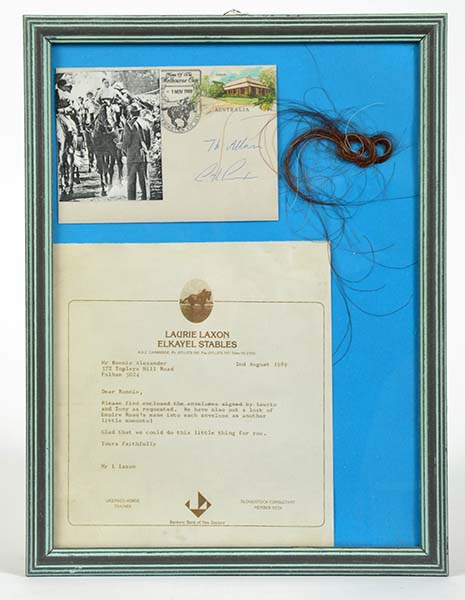 LOCK OF 1988 MELBOURNE CUP WINNER EMPIRE ROSES MANE AND ENVELOPE SIGNED BY TRAINER AND RIDER