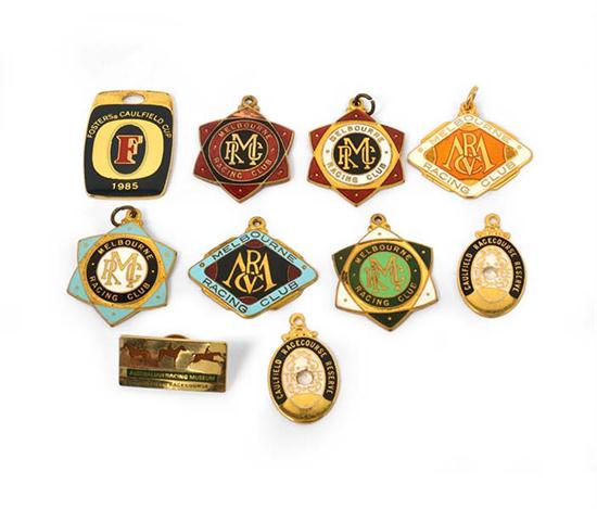 1954-61, by 'Stokes, Melb.', five numbered to verso including 1954-55, numbered '195'; 1955-56, numbered '838'; 1956-57, numbered '899'; 1959-60, numbered '1242'; and 1960-61, numbered '829', one with enamel slightly damaged; and four other Caulfield related badges (10)